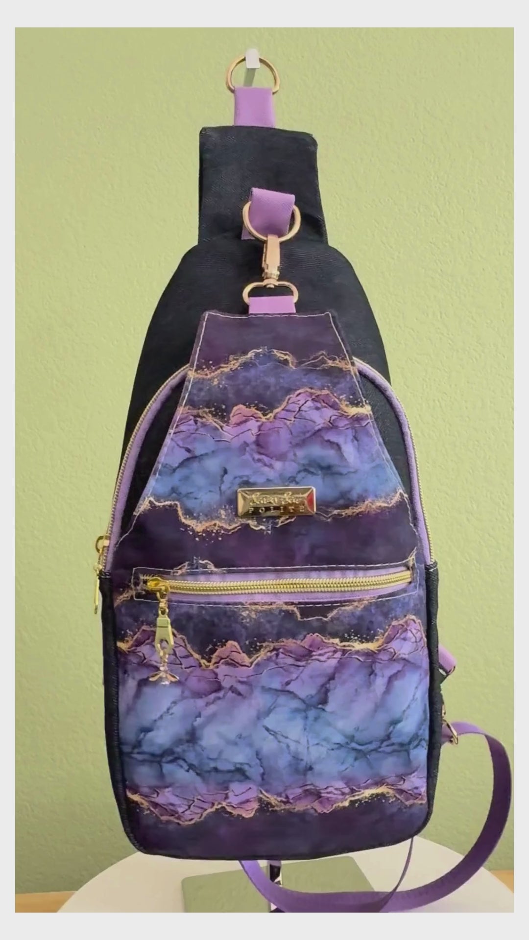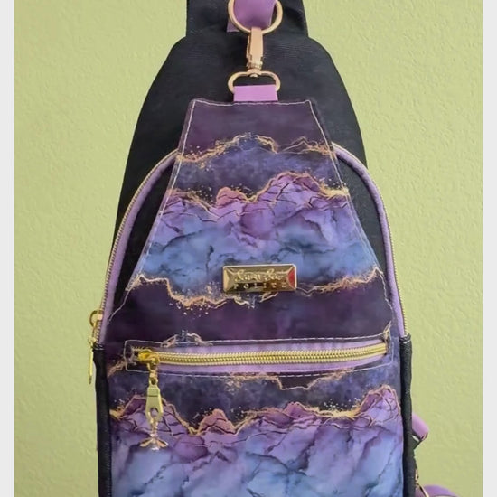 This sling bag allows for hands-free convenience and offers supreme comfort. With an adjustable strap for your preferred length. Designed with dark blue denim and accented with a striking Gemstone & Mineral inspired fabric, perfect for any occasion.