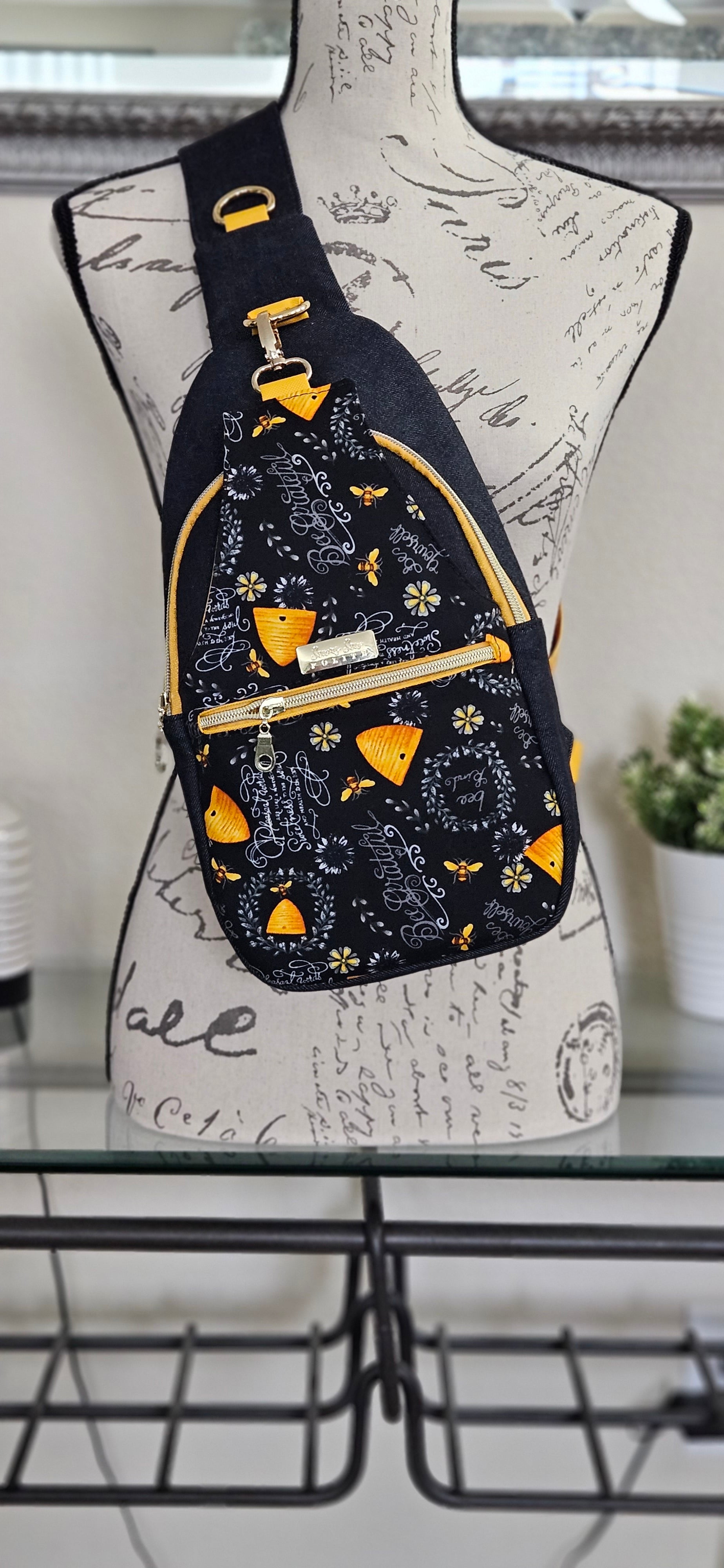 This sling bag allows for hands-free convenience and offers supreme comfort. With an adjustable strap for your preferred length. Designed with dark blue denim and accented with striking gold, grey and black bee fabric, perfect for any occasion.