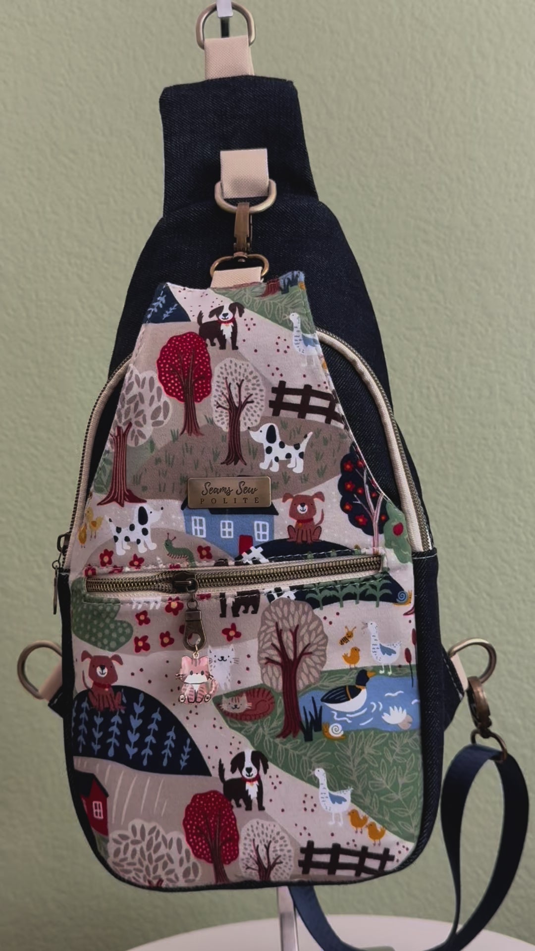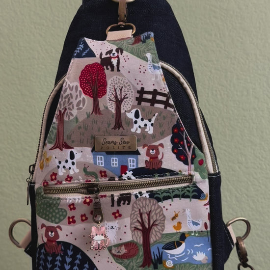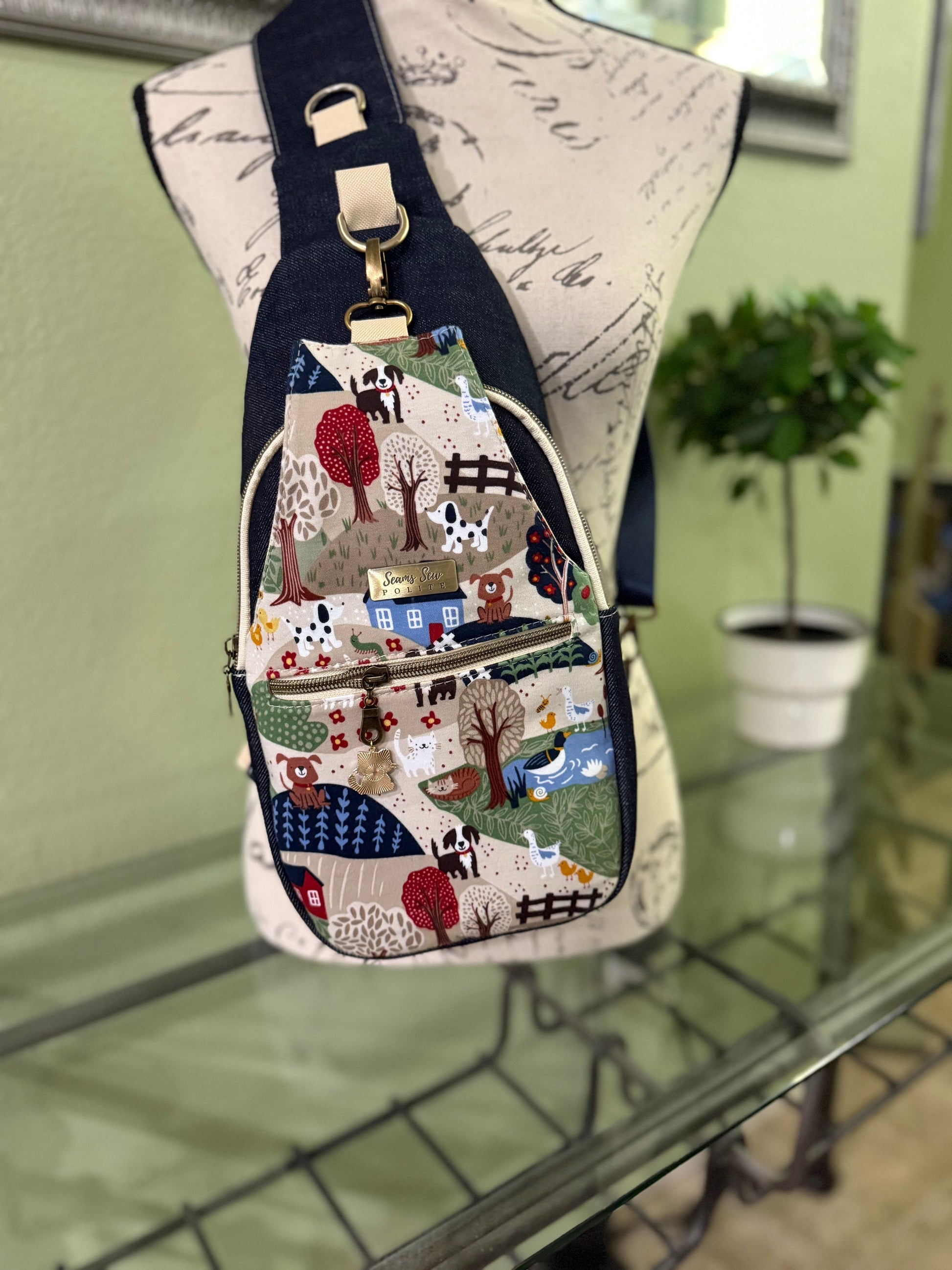 This sling bag allows for hands-free convenience and offers supreme comfort. With an adjustable strap for your preferred length. Designed with dark blue denim and accented with fun scenes of ducks, ducklings, bees, cat and dogs amidst trees, flowers and fences fabric. Perfect for any occasion.