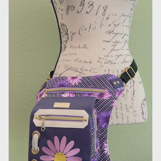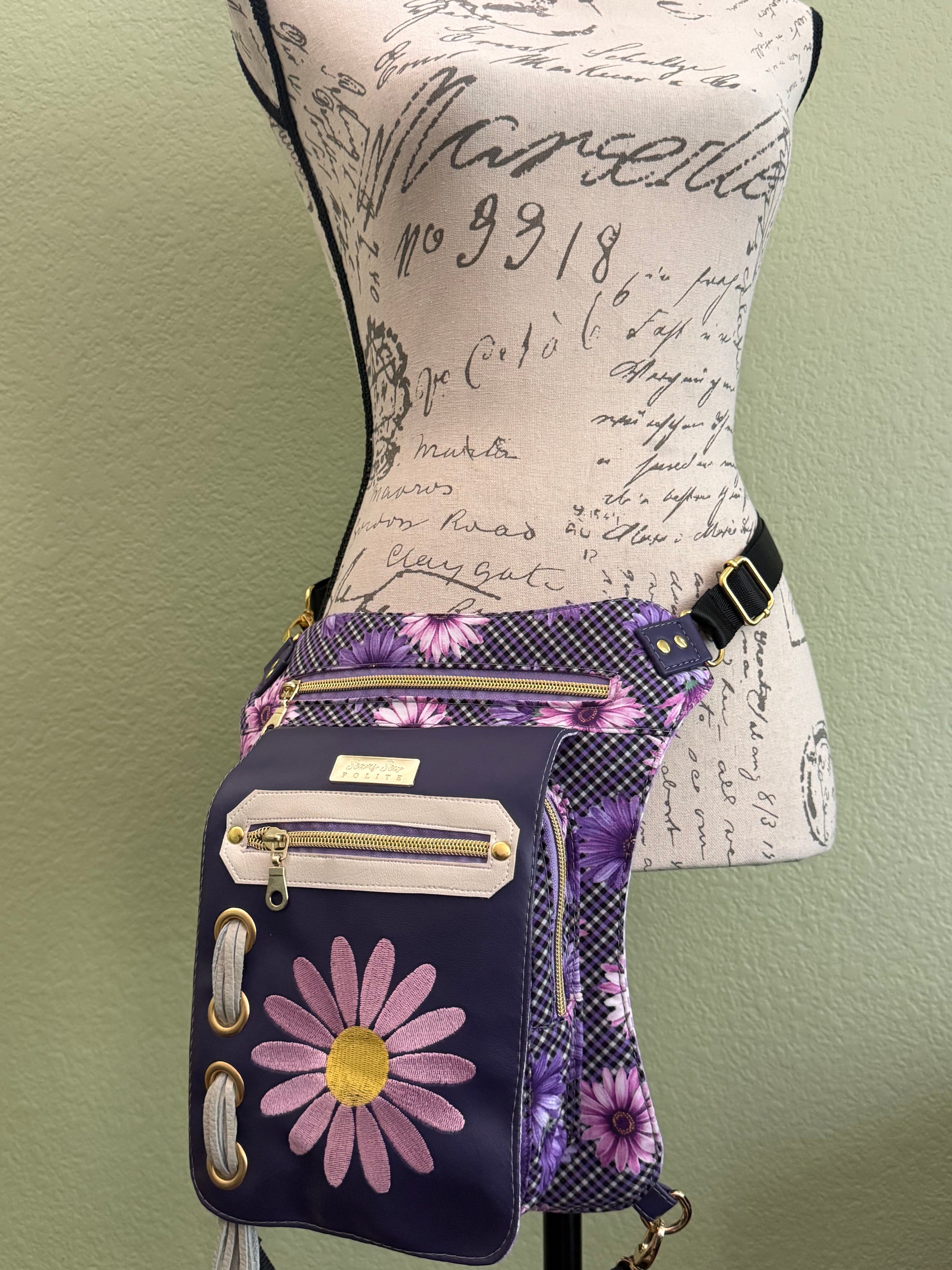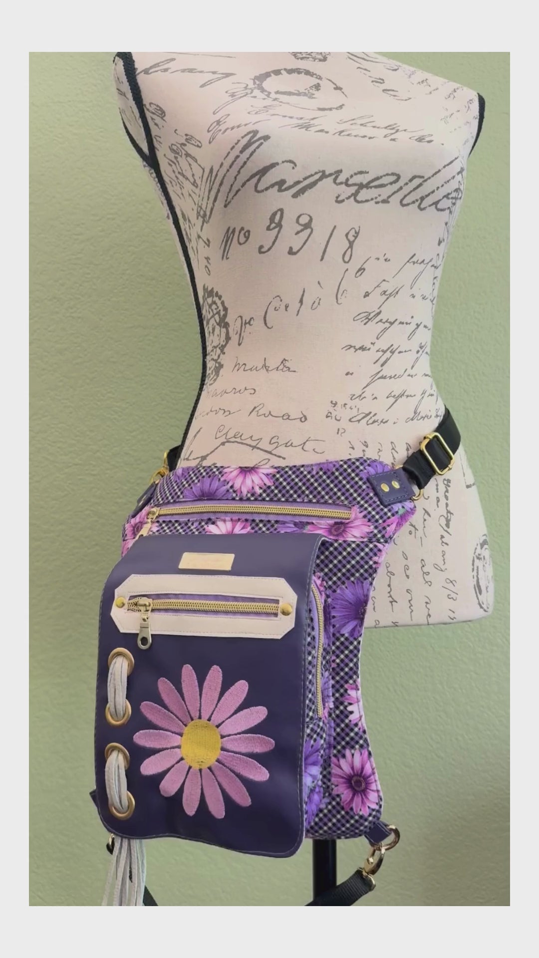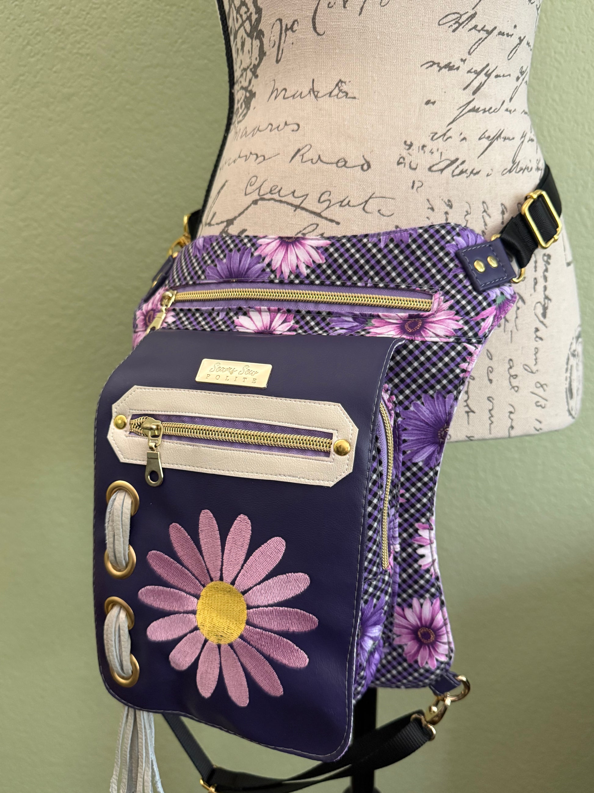 Daisy Blossom Rider is a versatile -style bag designed to be worn comfortably around the waist and secured to the thigh—or switch it up and rock it crossbody style! It featuring a charming embroidered daisy on its front panel. This eye-catching design adds a touch of floral flair to the bag's edgy silhouette. Includes three handy zippered pockets: one on the flap that’s perfect for a large phone, a roomy 2" deep main pocket hidden beneath the flap, and an extra-long 11.5" deep pocket that spans the height and width of the bag.