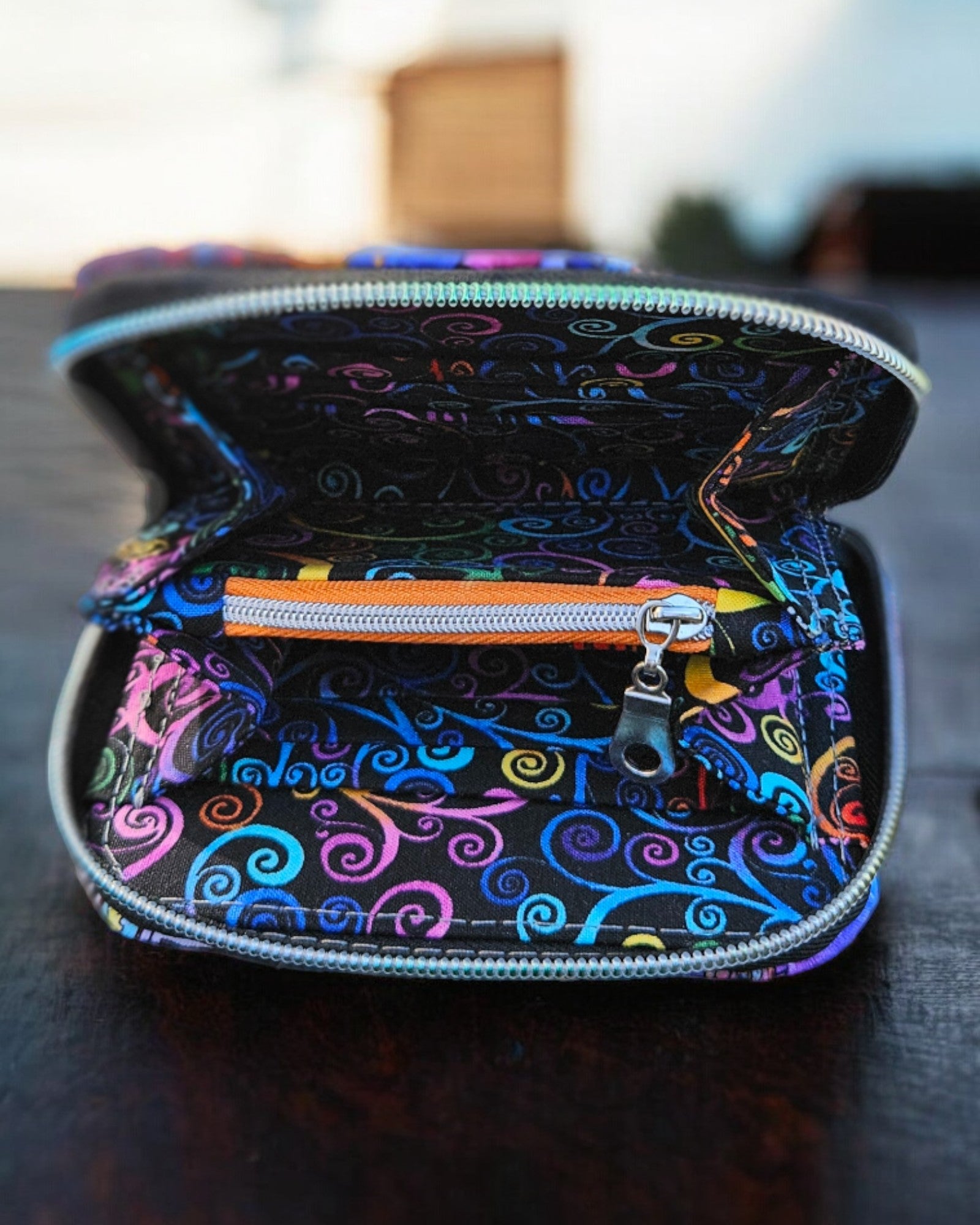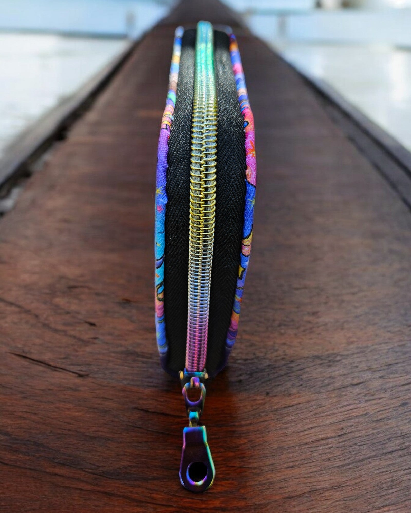 Introducing our one-of-a-kind wallet! Made from custom cotton lycra and vinyl trim this playful wallet is more than just an accessory - it's a celebration of individuality and fashion. With RFID protection included, you can trust your secrets will stay secure while standing out with bold colors, funky designs, and a touch of whimsy. Keep your essentials safe and make a statement with this durable and eye-catching wallet that's full of personality!